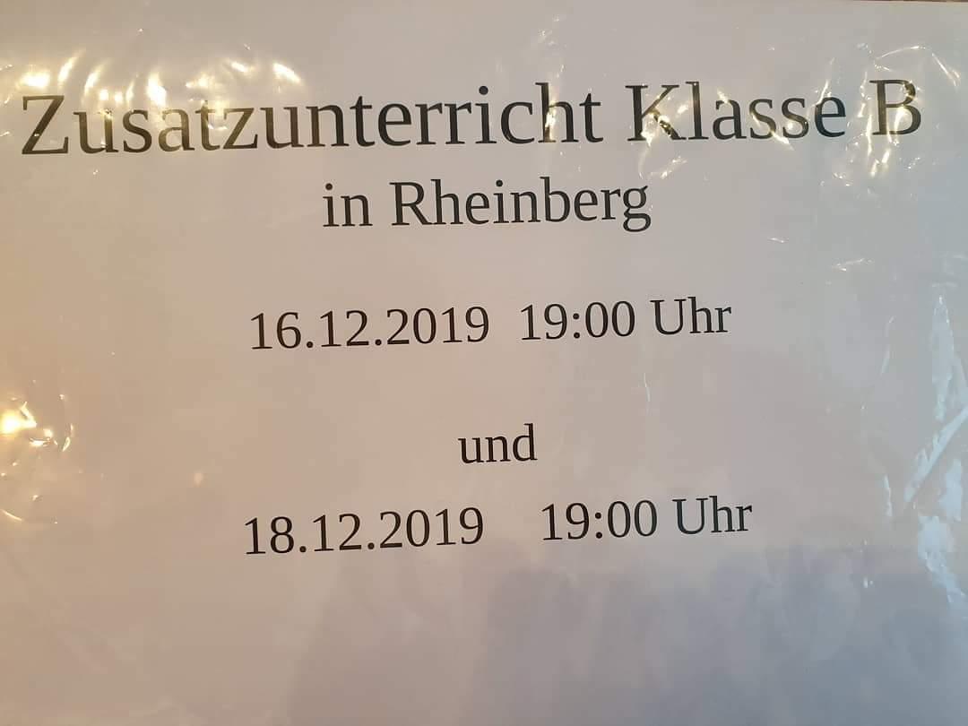Am Montag, den 16.12. und Mittwoch den 18.12. findet der Zusatzunterricht der Klasse B in unserer Fahrschule in Rheinberg um 19:00 Uhr statt.