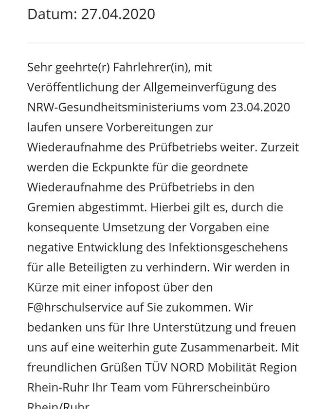 Die Vorgaben des NRW - Gesundheitsministeriums für den Prüfbetrieb laufen und man bespricht sich, wie man den Betrieb sicher aufnehmen kann. Man möchte verhindern, dass durch die Wiederaufnahme des Prüfbetriebs eine negative Entwicklung des Infektionsgeschehens erfolgt. Sobald wir die "InfoPost" erhalten, werden wir hier berichten und mitteilen, wie es weiter geht.