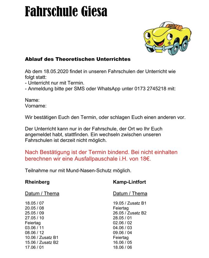 Ab dem 18.05.2020 findet in unseren Fahrschulen der Unterricht wie folgt statt:
