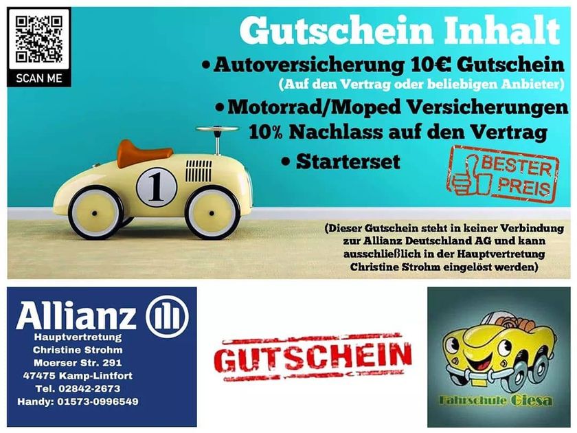 (Dieser Gutschein steht in keiner Verbindung zur Allianz Deutschland AG und kann ausschließlich in der Hauptvertretung Christiane Strohm eingelöst werden)