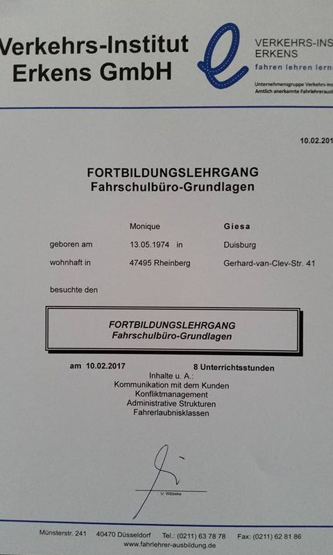 Auch die Mitarbeiter unserer Büro´s werden fortgebildet. Deshalb haben wir unsere Mitarbeiterin Monique Giesa zu einem Fortbildungslehrgang "Fahrschulbüro-Grundlagen entsandt.